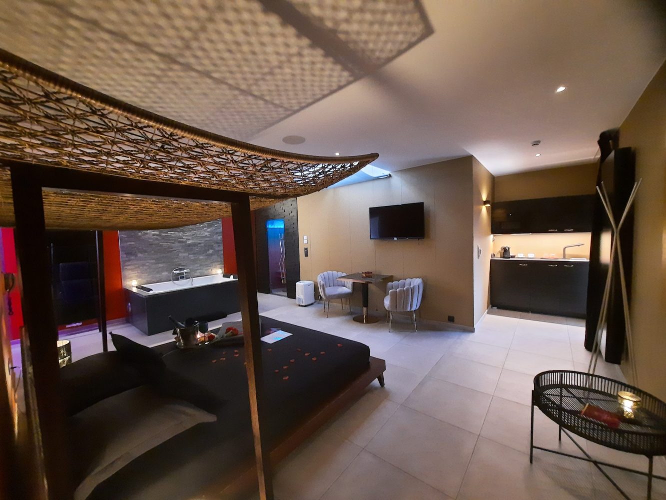 Optez pour une déco gold & black et une atmosphère digne de James Bond, dans cette suite luxueuse avec jacuzzi.