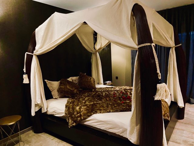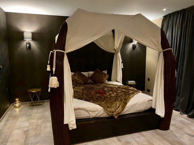 Cette chambre vous emmène tout droit en Orient. Elle dispose d'un coin salon et d'un lit à baldaquins.